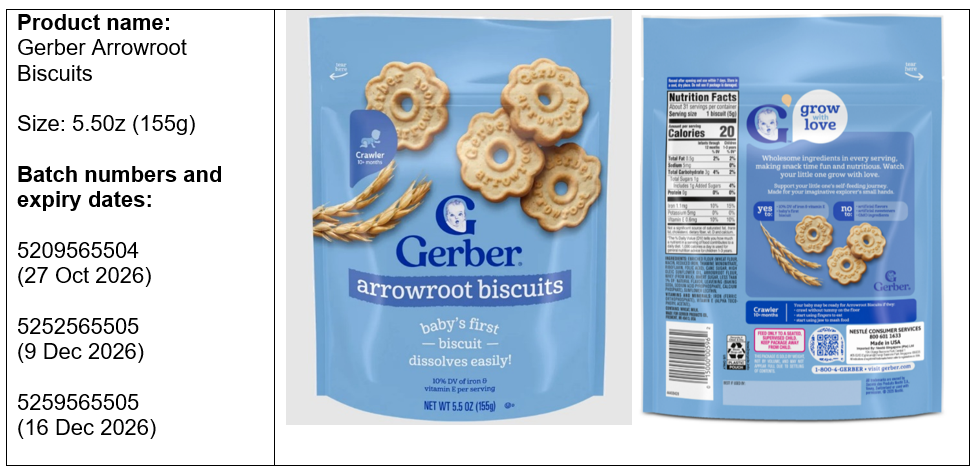 The Singapore Food Agency (SFA) was informed by Nestlé Singapore Pte Ltd on the voluntary recall of various Gerber Arrowroot Biscuits products by the manufacturer in the USA, due to potential presence of foreign matter (soft plastic/paper pieces).