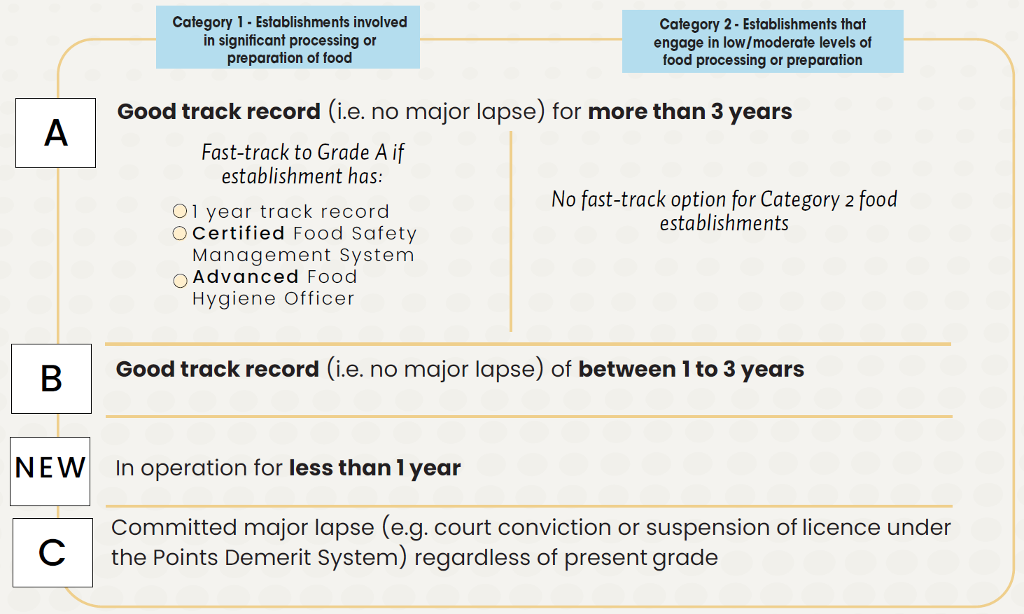 Each establishment is assigned a grade ‘A’, ‘B’, or ‘C’ based on its food safety track records, and implementation of a Food Safety Management System (FSMS) with the appointment of an Advanced Food Hygiene Officer (AFHO).
