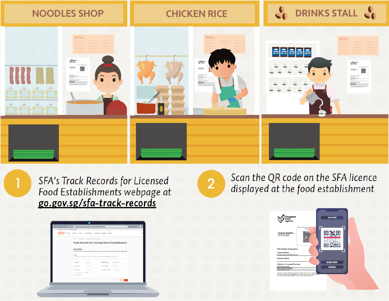 With SAFE, consumers can easily access grades by scanning QR codes displayed on SFA licences at food establishments, or by visiting SFA's Track Records for Licensed Food Establishments webpage online. This digital approach ensures consumers receive the most up-to-date and accurate information about each establishment's grade and track record, mitigating the risk of outdated decals being displayed at premises. Establishments must remove their old grade decals and ensure that only current, accurate grade information is available to consumers.