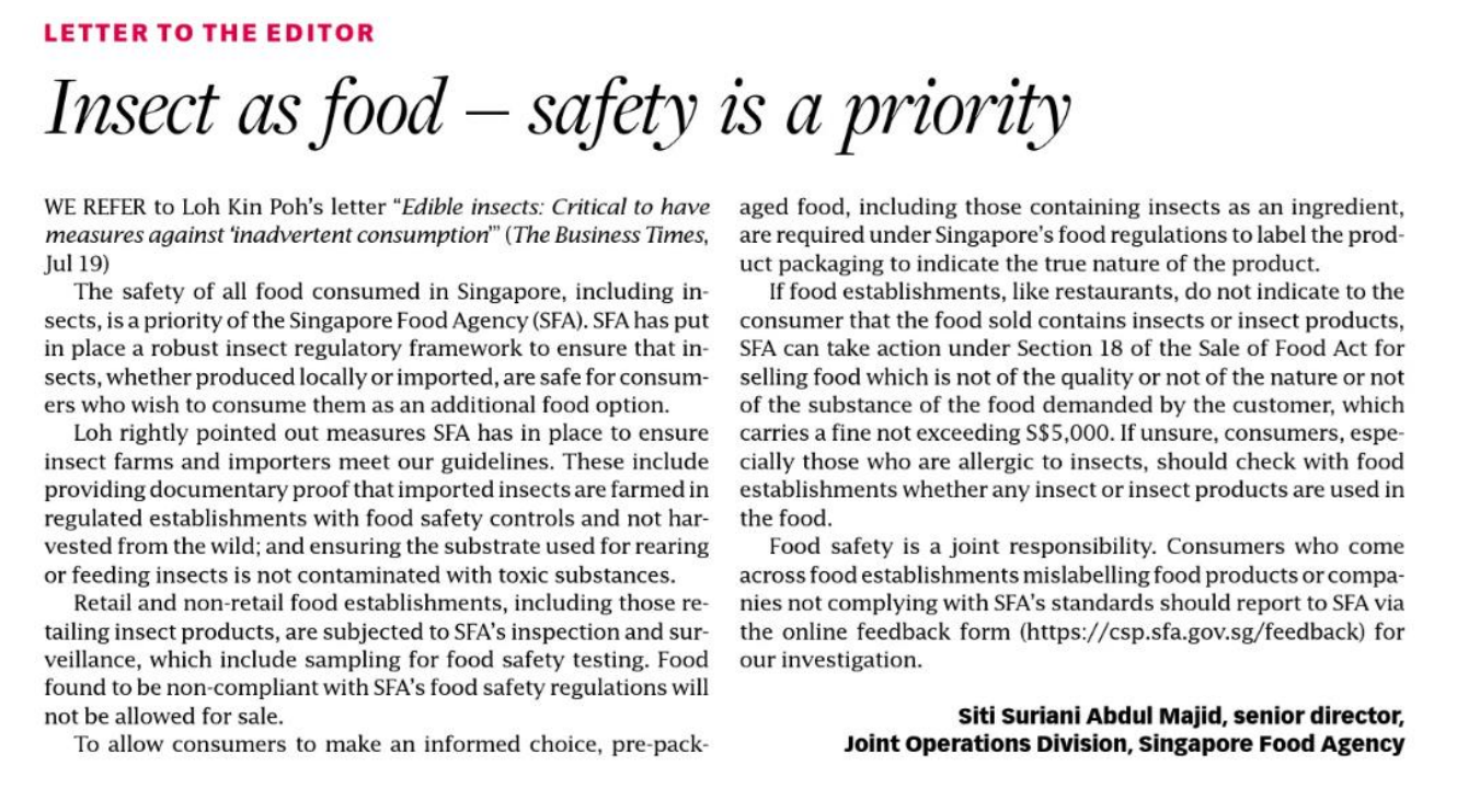 We refer to Loh Kin Poh’s letter: Edible insects: Critical to have measures against 'inadvertent consumption' (The Business Times, Jul 19).