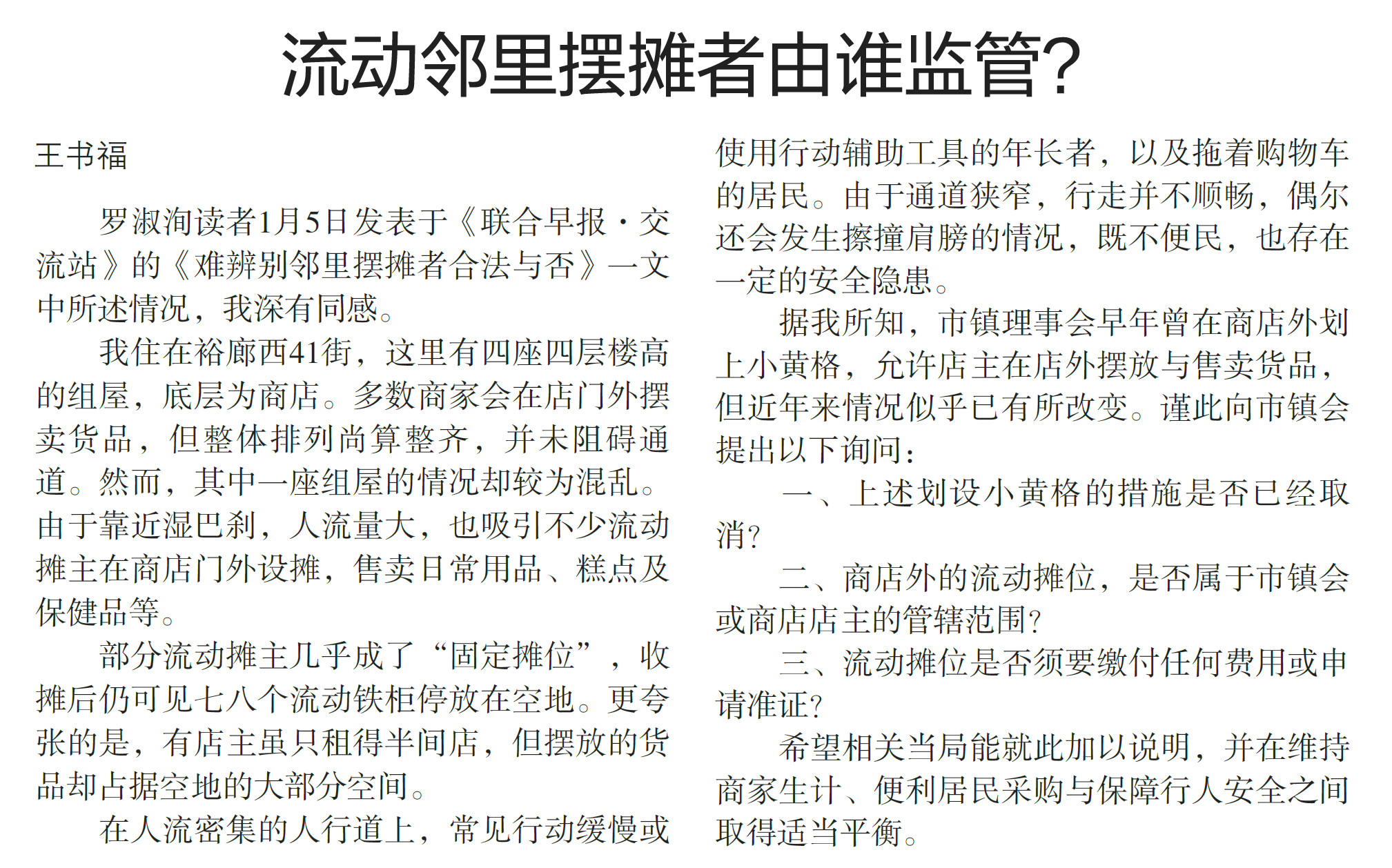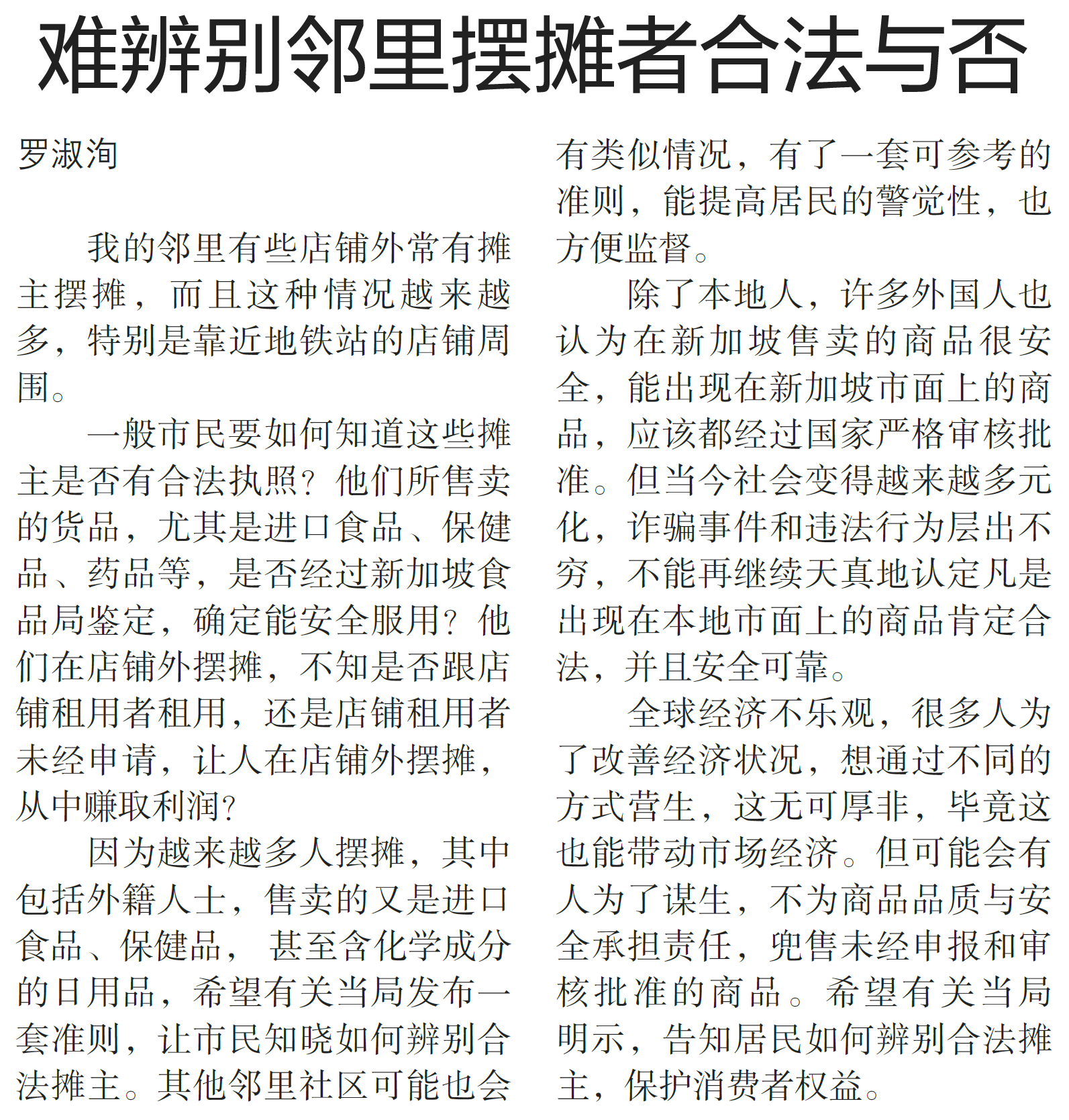 We refer to the letter by Luo Shuxun, “Difficult to determine whether neighbourhood vendors are operating legally (难辨别邻里摆摊者合法与否)” (5 Jan) and the letter by Wang Shufu, “Who regulates mobile street vendors in neighbourhoods? (流动邻里摆摊者由谁监管?)” (8 Jan).