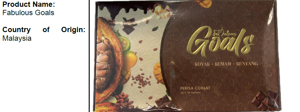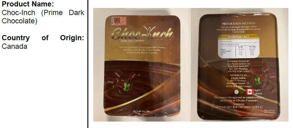 The Singapore Food Agency (SFA) has detected Sibutramine (a medicinal substance) in Choc-Inch (Prime Dark Chocolate) and Fabulous Goals.